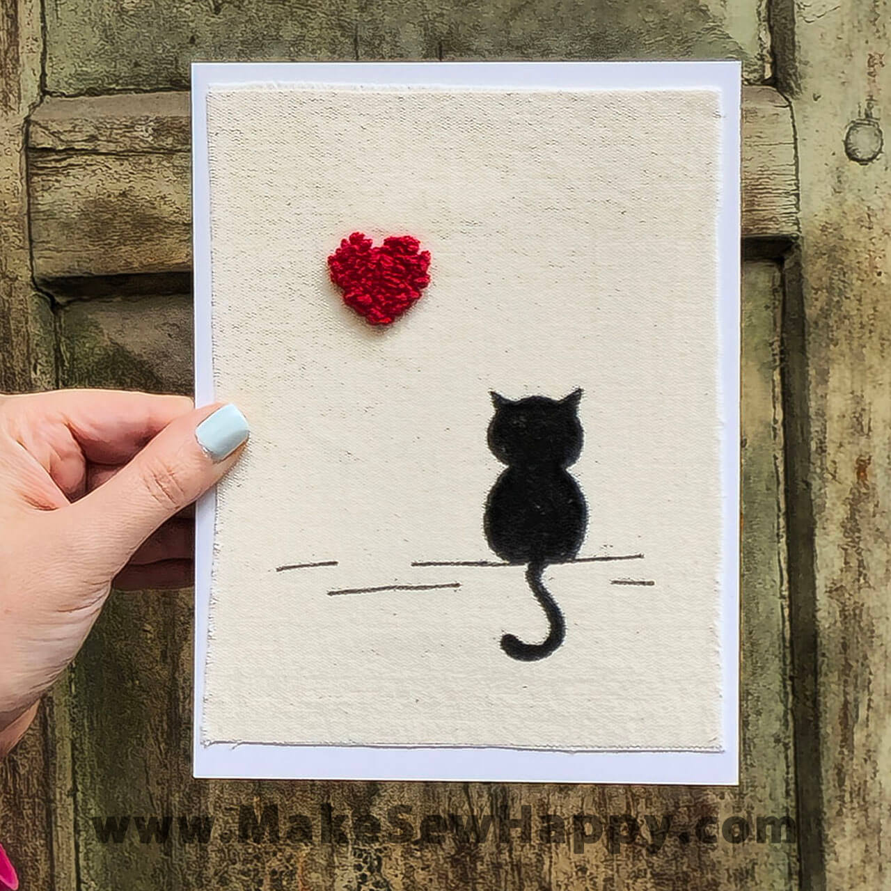 کارت پستال پارچه‌ای طرح گربه سیاه و قلب قرمز