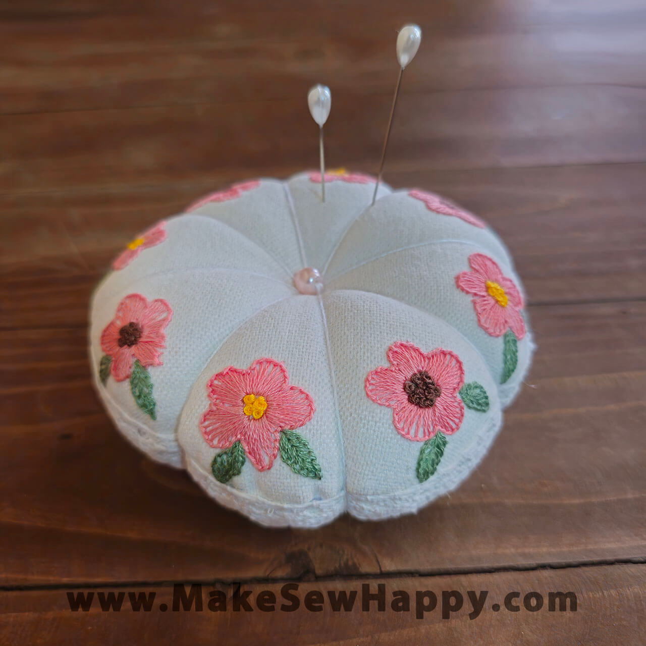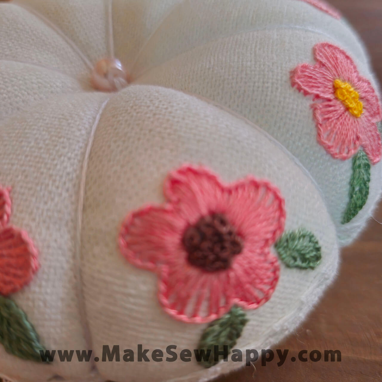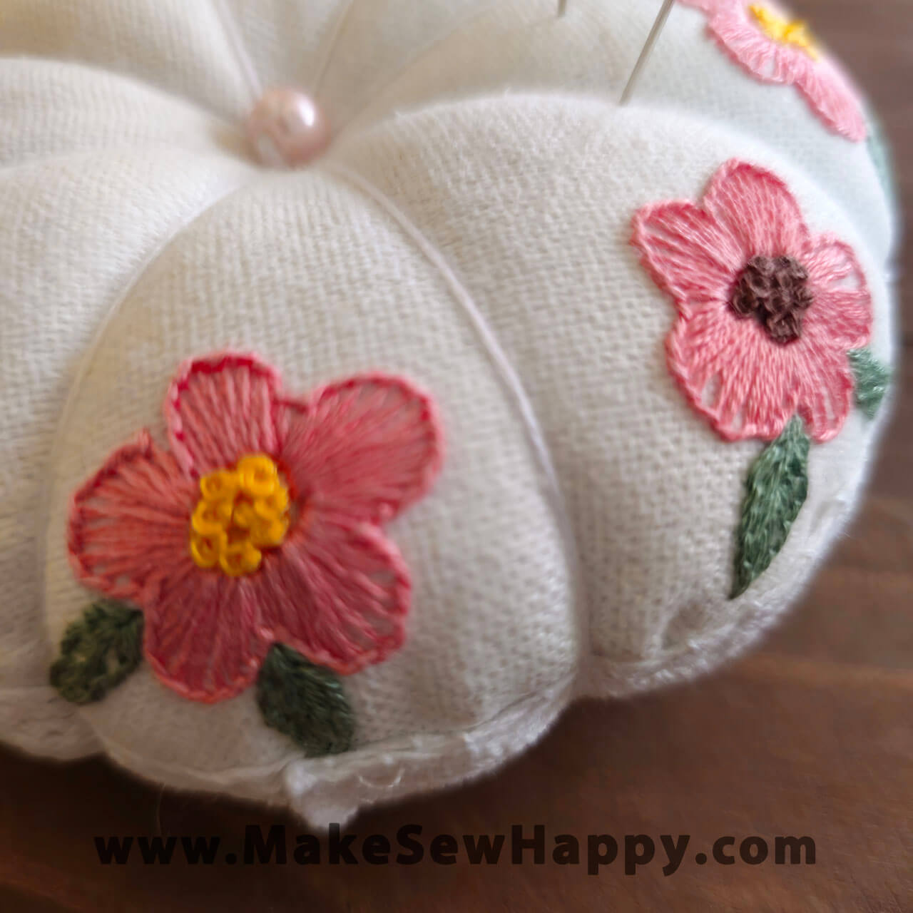 جا سوزنی پارچه‌ای طرح گل‌دوزی رنگ سفید با گل‌های صورتی