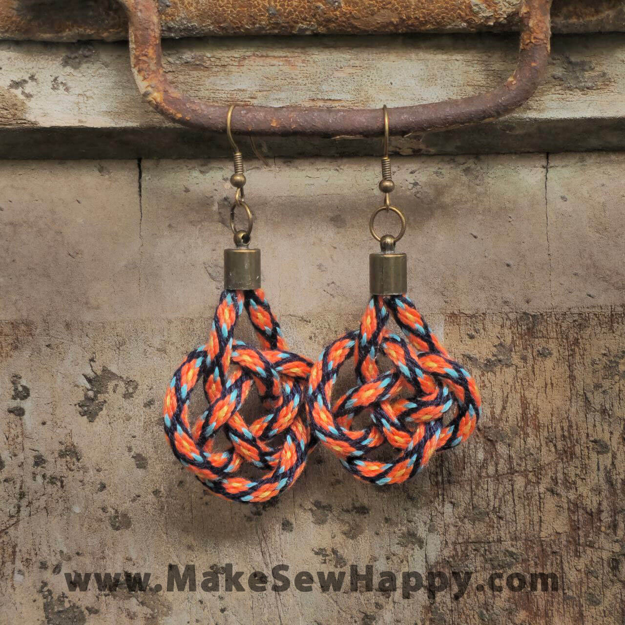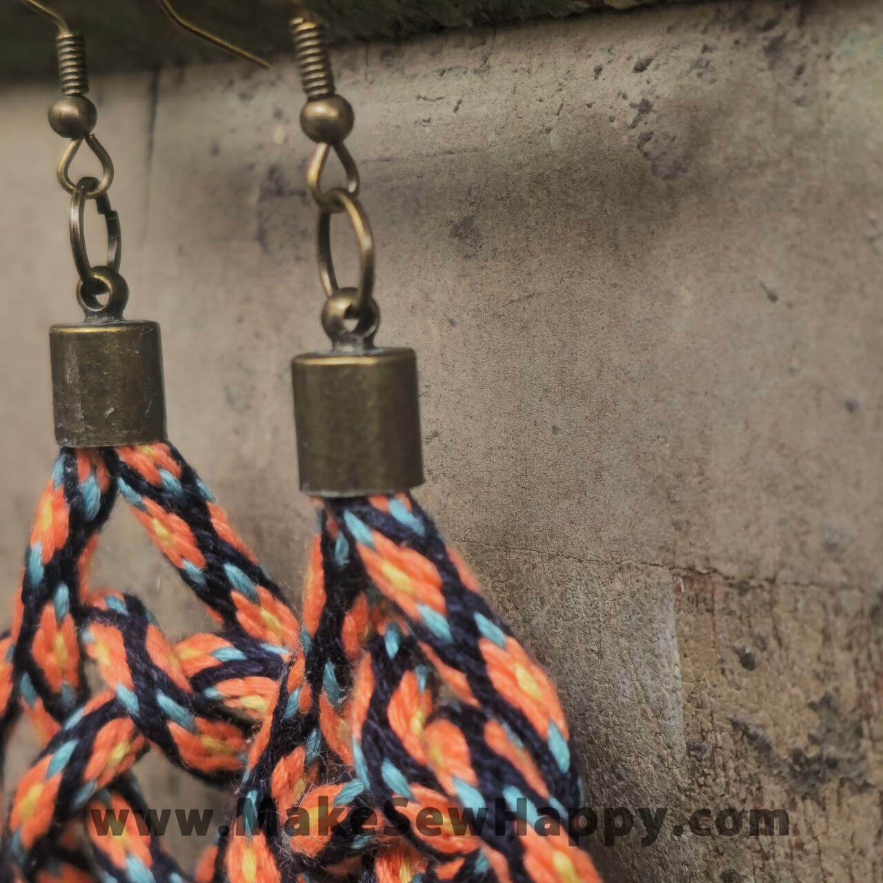گوشواره نخی بافت رنگ نارنجی و سرمه‌ای و آبی روشن