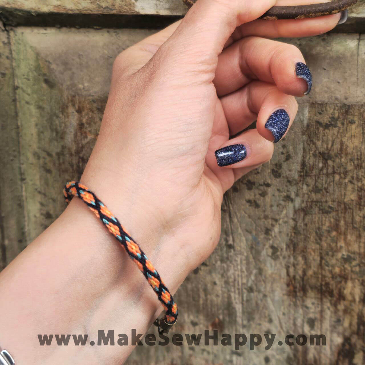 دستبند نخی طرح ضربدر رنگ مشکی و نارنجی و آبی روشن
